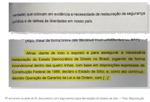 A “minuta do golpe” era um documento que propunha a decretação de um estado de sítio ou de defesa (medidas extremas que dão mais poder ao governo em situações de emergência) para anular o resultado das eleições de 2022 e impedir que Luiz Inácio Lula da Silva tomasse posse como presidente.