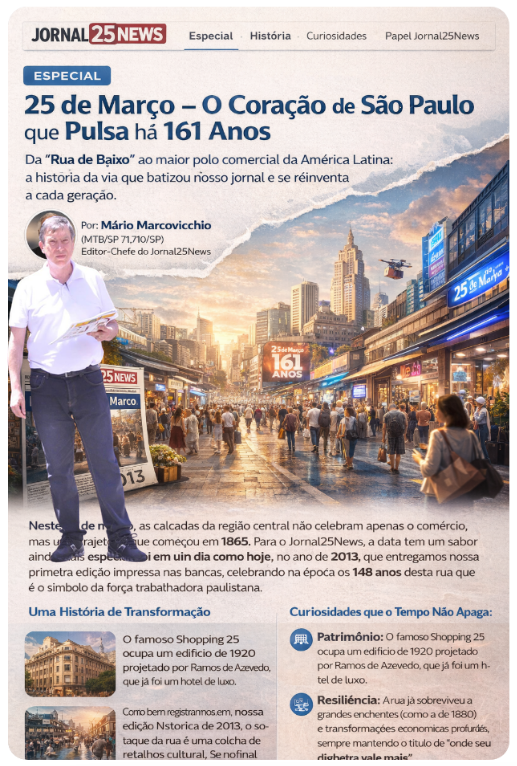 Neste 25 de março, as calçadas da região central não celebram apenas o comércio, mas uma trajetória que começou em 1865. Para o Jornal25News, a data tem um sabor ainda mais especial: foi em um dia como hoje, no ano de 2013, que entregamos nossa primeira edição impressa nas bancas, celebrando na época os 148 anos desta rua que é o símbolo da força trabalhadora paulistana.
