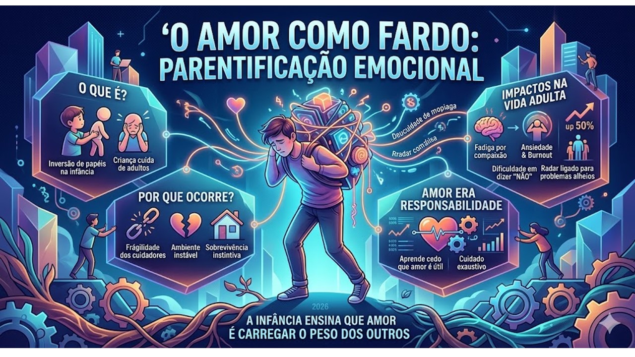 - Impacto na Saúde: Estudos de saúde mental, correlacionam adultos parentificados com um risco 50% maior de desenvolver quadros de Burnout e fadiga por compaixão.