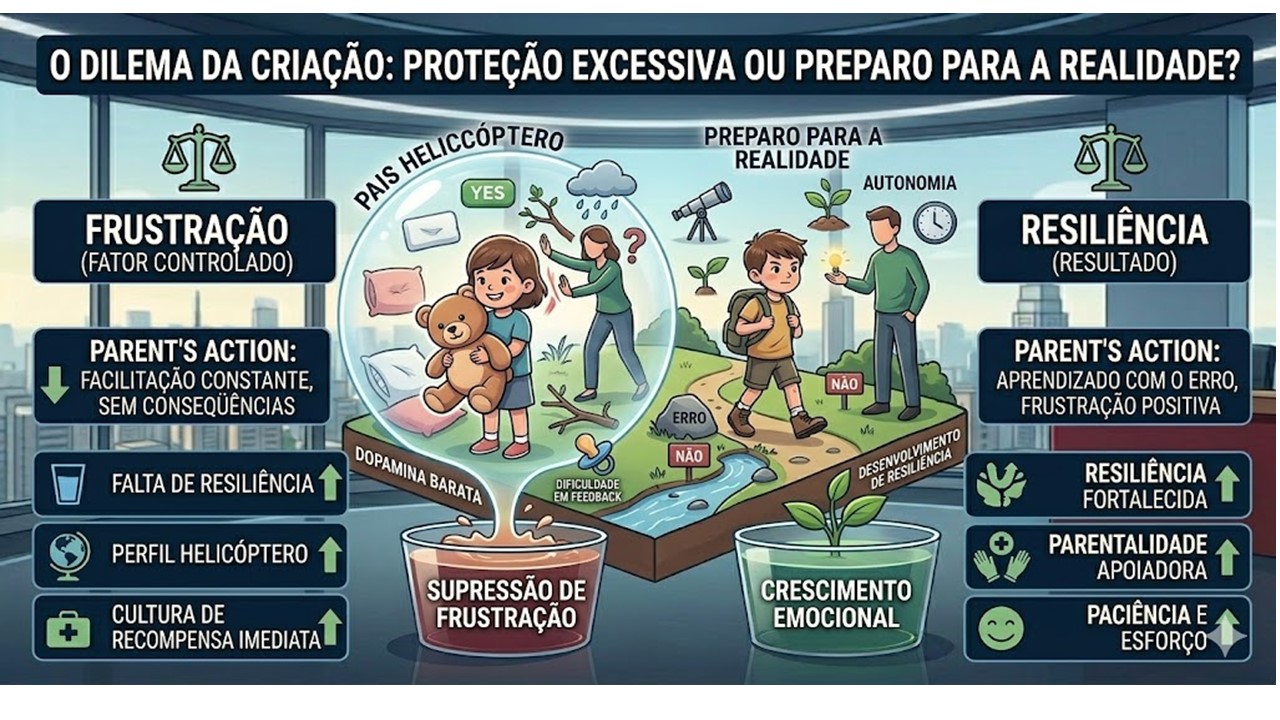 Especialistas explicam que muitos pais modernos, motivados pela culpa da ausência ou pelo medo da violência do mundo, adotaram a “parentalidade helicóptero” (onde sobrevoam a vida dos filhos o tempo todo), ou a “parentalidade limpa-trilhos” (onde removem qualquer obstáculo antes que a criança o encontre).