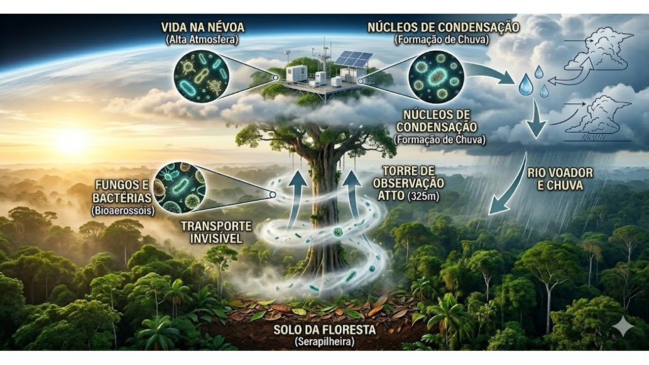 COMO O SOLO SOBE AO CÉU: A descoberta quebra o paradigma de que microrganismos atmosféricos seriam apenas “poeira ao vento”. O nevoeiro amazônico atua como um mediador: