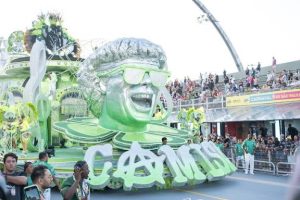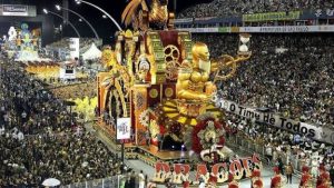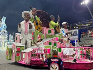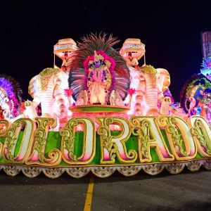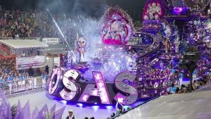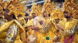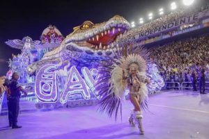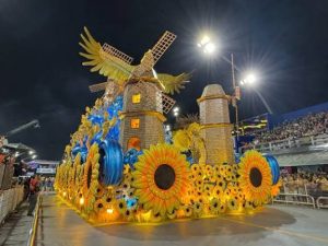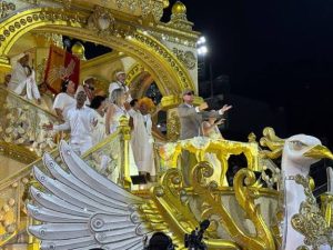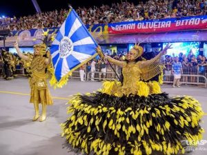 O desfile encerra a primeira noite com um tributo à orixá Oxum, divindade das águas doces, do amor e da fertilidade, celebrando espiritualidade, beleza e conexão afetiva entre seres humanos e natureza.