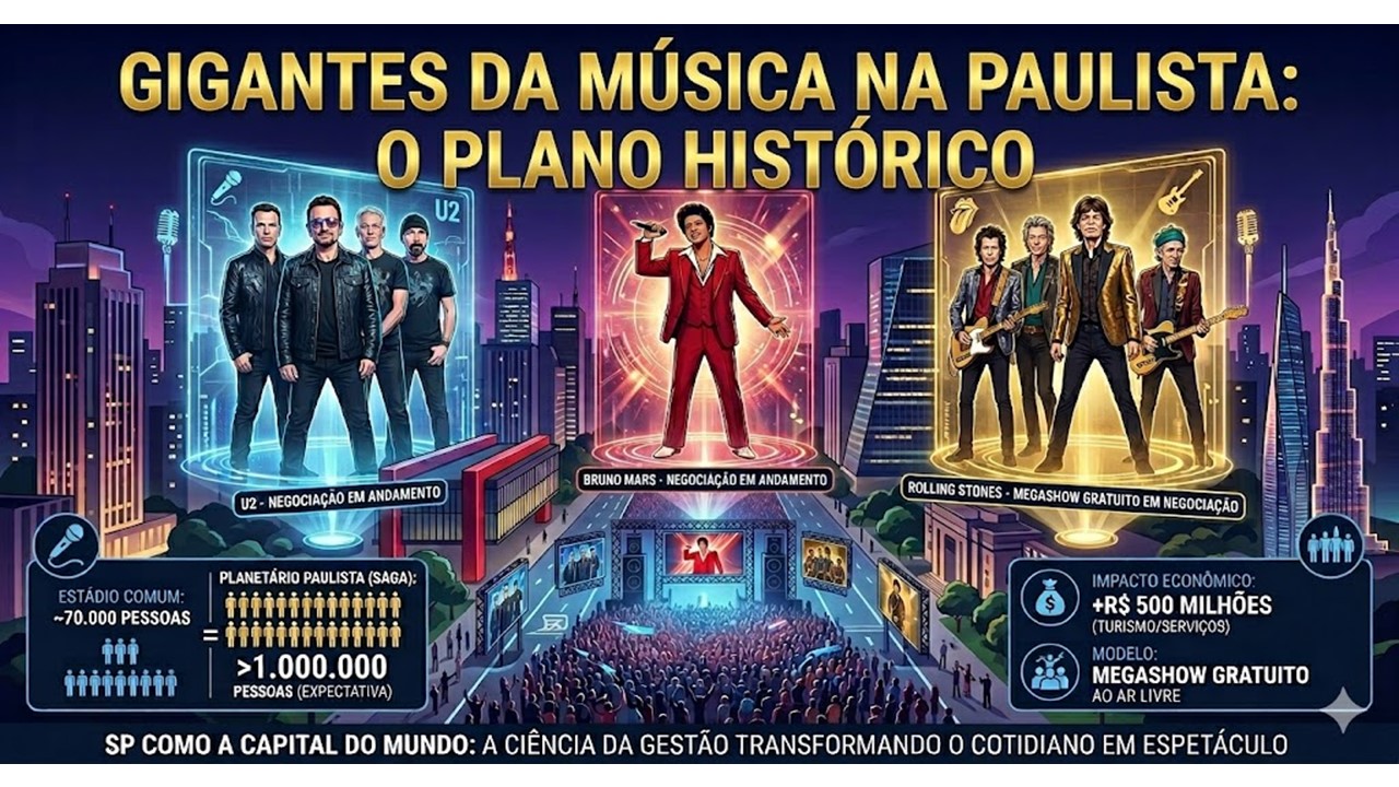A Avenida Paulista pode estar prestes a se tornar o epicentro da música mundial em 2026. O prefeito Ricardo Nunes (MDB), confirmou que a gestão municipal está em tratativas avançadas para trazer não apenas os lendários Rolling Stones, mas também o gigante irlandês U2 e o fenômeno pop Bruno Mars para apresentações gratuitas no coração da capital.