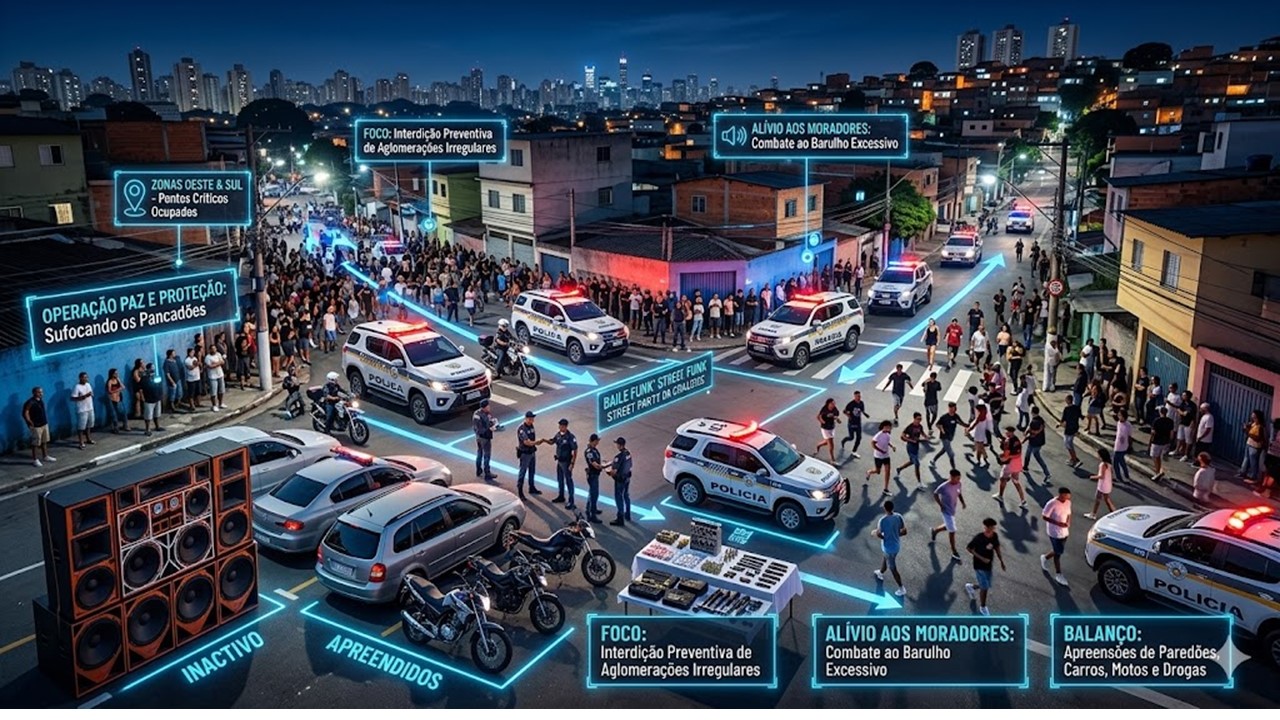O final de semana foi de forte presença policial nas ruas das zonas Oeste e Sul de São Paulo. A Polícia Militar, por meio da “Operação Paz e Proteção”, intensificou o cerco aos chamados “pancadões” — bailes funk de rua que ocorrem de forma irregular.