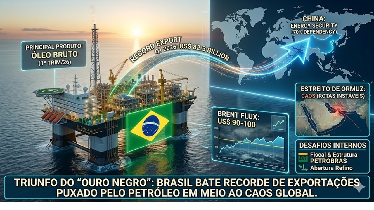 Enquanto o mapa geopolítico mundial se fragmenta, a balança comercial brasileira atinge números sem precedentes. O Brasil fechou o primeiro trimestre de 2026 com um recorde histórico de US$ 82,3 bilhões em exportações, um salto impulsionado quase inteiramente pela sede global por energia estável.